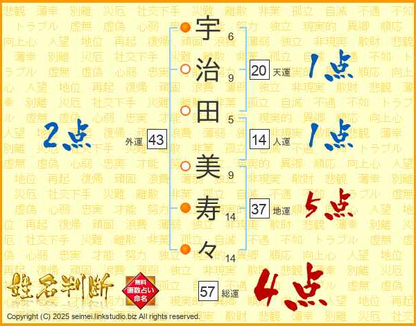宇(6画)治(9画)田(5画) 美(9画)寿(14画)々(14画)