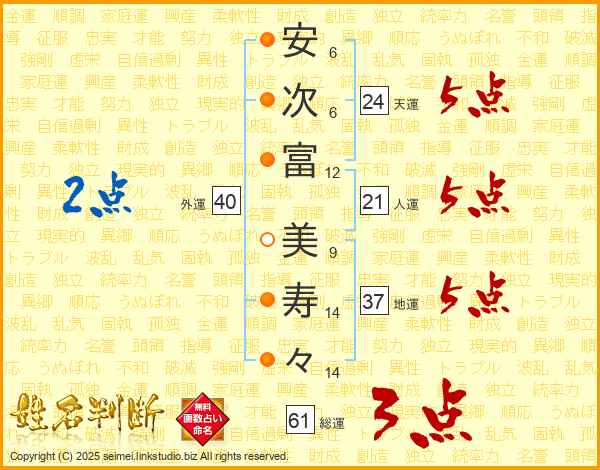 安(6画)次(6画)富(12画) 美(9画)寿(14画)々(14画)