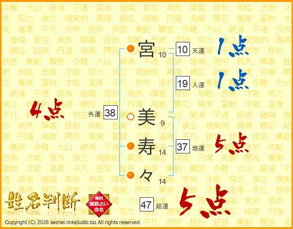 生活面を象徴する運勢です。外部から受ける影響力を表し、結婚運、家庭運や職場、環境への順応性を表します。総運から人運を引いた画数。姓や名が1文字の場合を除く。