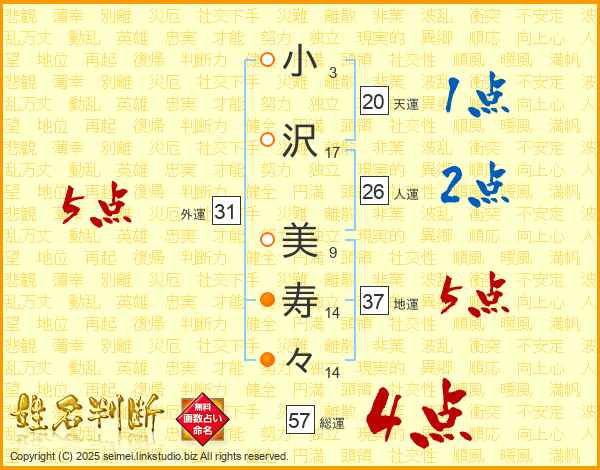 小(3画)沢(17画) 美(9画)寿(14画)々(14画)
