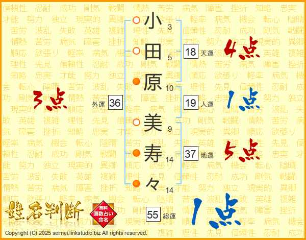 小(3画)田(5画)原(10画) 美(9画)寿(14画)々(14画)