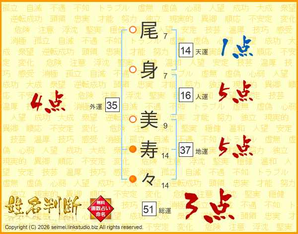 尾(7画)身(7画) 美(9画)寿(14画)々(14画)