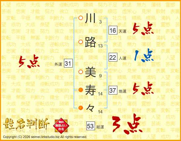 川(3画)路(13画) 美(9画)寿(14画)々(14画)