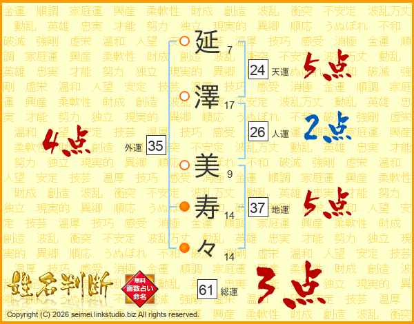 延(7画)澤(17画) 美(9画)寿(14画)々(14画)
