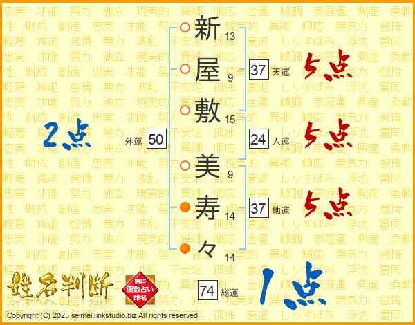 新(13画)屋(9画)敷(15画) 美(9画)寿(14画)々(14画)