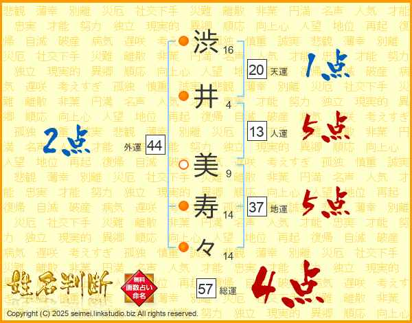 渋(16画)井(4画) 美(9画)寿(14画)々(14画)