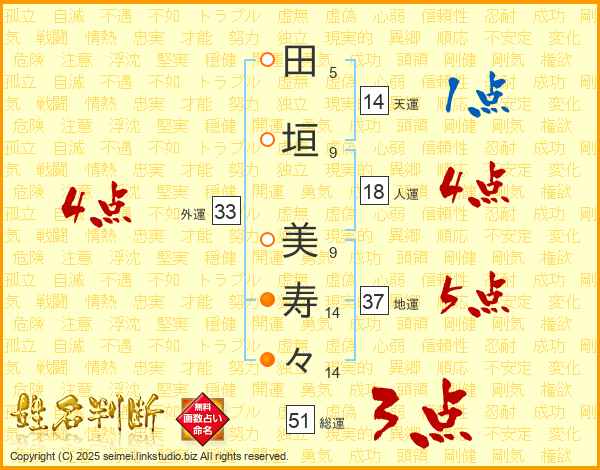 田(5画)垣(9画) 美(9画)寿(14画)々(14画)