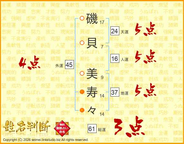 磯(17画)貝(7画) 美(9画)寿(14画)々(14画)