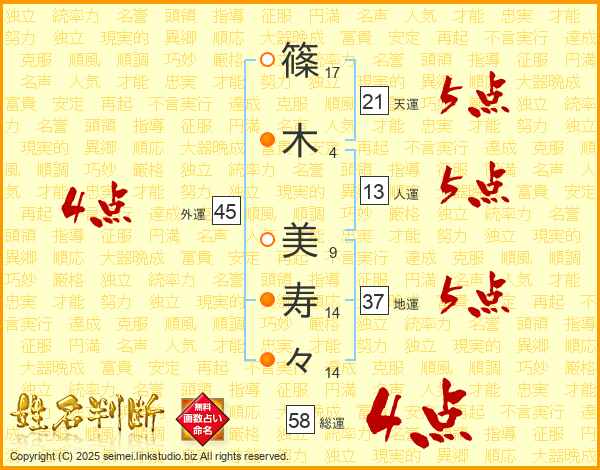 篠(17画)木(4画) 美(9画)寿(14画)々(14画)