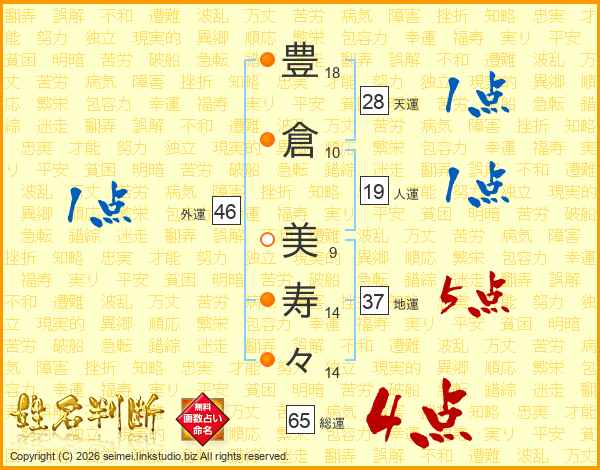 豊(18画)倉(10画) 美(9画)寿(14画)々(14画)