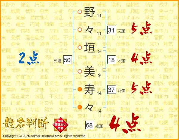 野(11画)々(11画)垣(9画) 美(9画)寿(14画)々(14画)