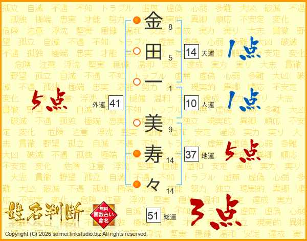 金(8画)田(5画)一(1画) 美(9画)寿(14画)々(14画)