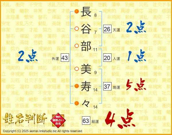 長(8画)谷(7画)部(11画) 美(9画)寿(14画)々(14画)