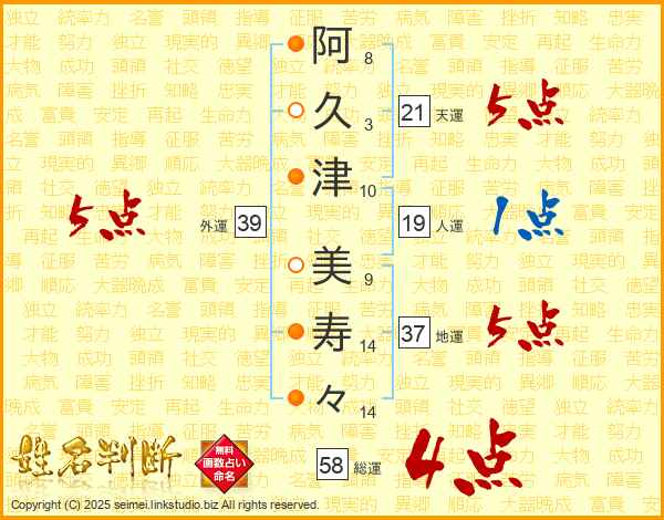 阿(8画)久(3画)津(10画) 美(9画)寿(14画)々(14画)