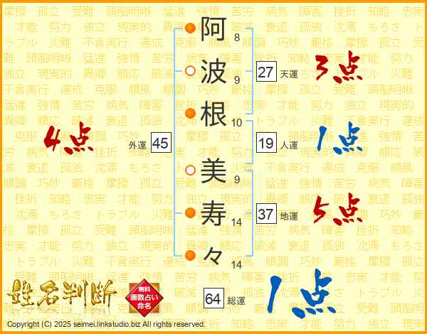 阿(8画)波(9画)根(10画) 美(9画)寿(14画)々(14画)