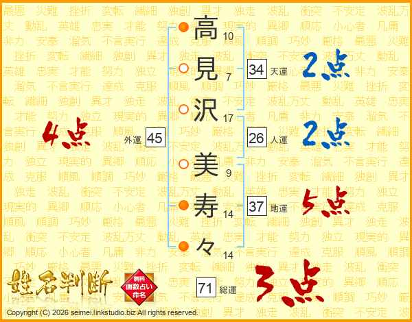 高(10画)見(7画)沢(17画) 美(9画)寿(14画)々(14画)