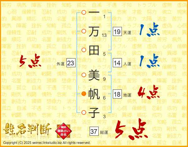 一(1画)万(13画)田(5画) 美(9画)帆(6画)子(3画)