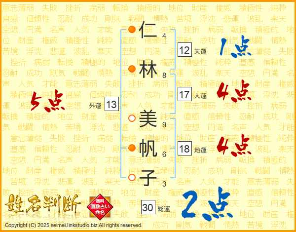仁(4画)林(8画) 美(9画)帆(6画)子(3画)