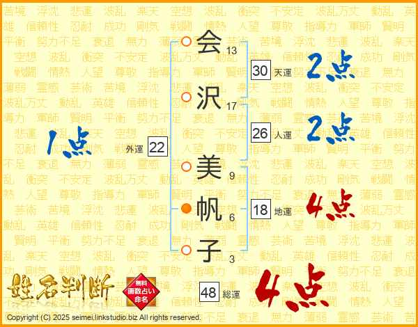 会(13画)沢(17画) 美(9画)帆(6画)子(3画)