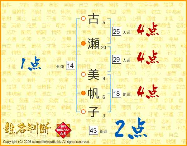 古(5画)瀬(20画) 美(9画)帆(6画)子(3画)