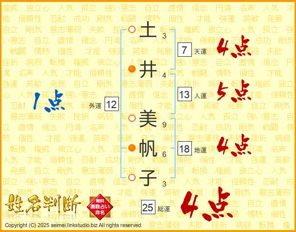 土(3画)井(4画) 美(9画)帆(6画)子(3画)