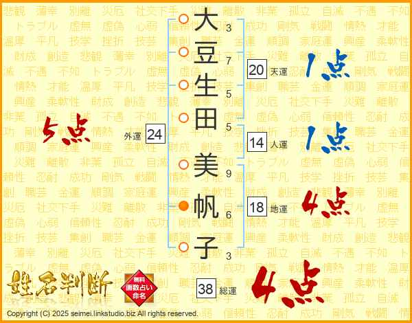 大(3画)豆(7画)生(5画)田(5画) 美(9画)帆(6画)子(3画)