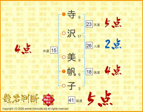 寺(6画)沢(17画) 美(9画)帆(6画)子(3画)