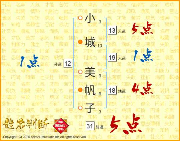 小(3画)城(10画) 美(9画)帆(6画)子(3画)