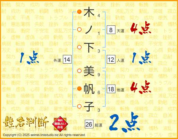 木(4画)ノ(1画)下(3画) 美(9画)帆(6画)子(3画)