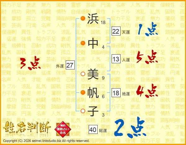 浜(18画)中(4画)  美(9画)帆(6画)子(3画)