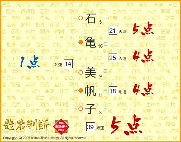 石(5画)亀(16画) 美(9画)帆(6画)子(3画)