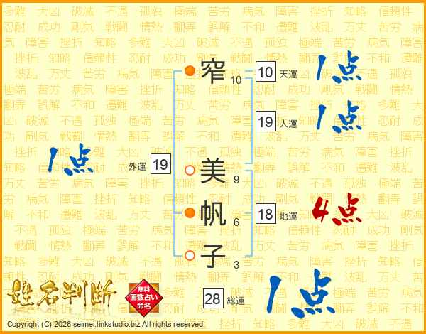 生活面を象徴する運勢です。外部から受ける影響力を表し、結婚運、家庭運や職場、環境への順応性を表します。総運から人運を引いた画数。姓や名が1文字の場合を除く。