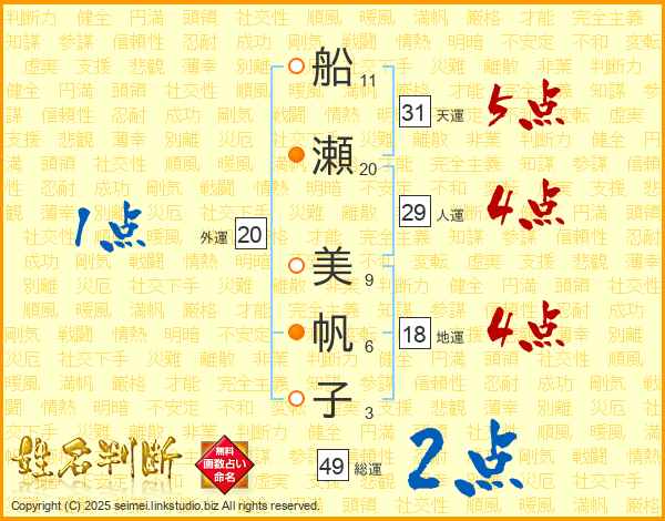 船(11画)瀬(20画) 美(9画)帆(6画)子(3画)