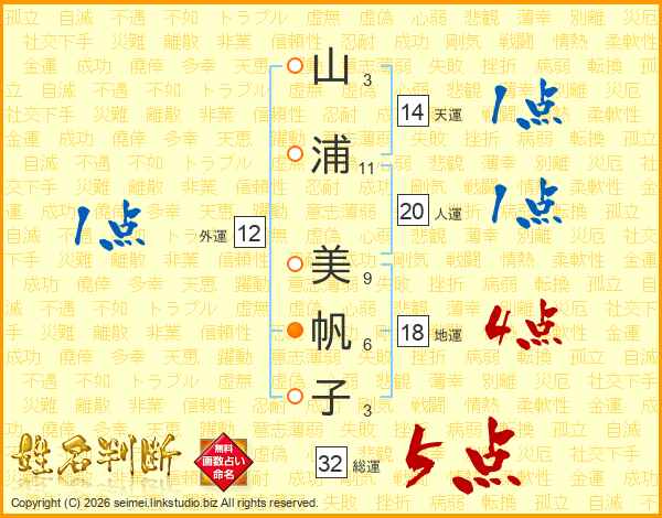 山(3画)浦(11画) 美(9画)帆(6画)子(3画)