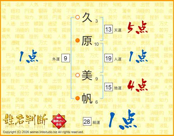 久(3画)原(10画) 美(9画)帆(6画)