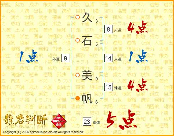 久(3画)石(5画) 美(9画)帆(6画)