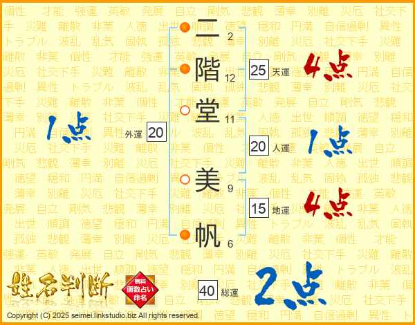 二(2画)階(12画)堂(11画) 美(9画)帆(6画)