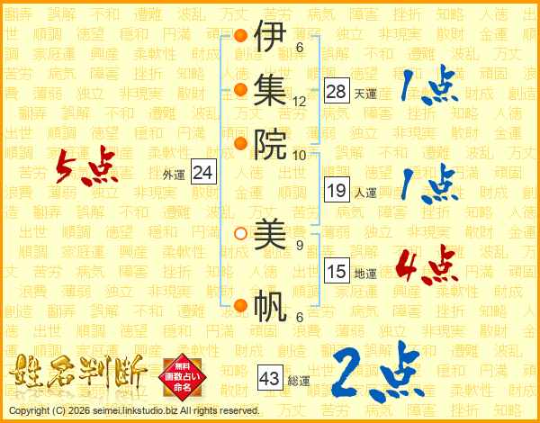 伊(6画)集(12画)院(10画) 美(9画)帆(6画)