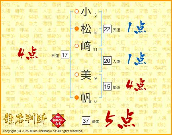 小(3画)松(8画)﨑(11画) 美(9画)帆(6画)