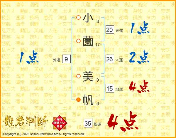 小(3画)薗(17画) 美(9画)帆(6画)