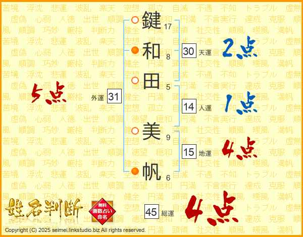 鍵(17画)和(8画)田(5画) 美(9画)帆(6画)