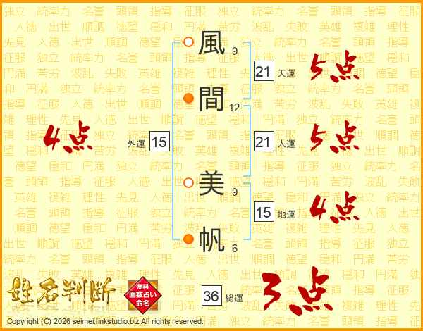 風(9画)間(12画) 美(9画)帆(6画)