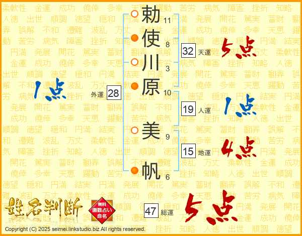 勅(11画)使(8画)川(3画)原(10画) 美(9画)帆(6画)