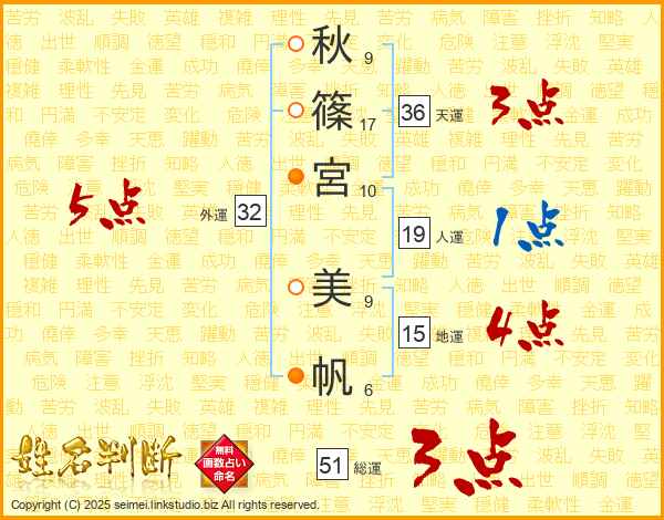 秋(9画)篠(17画)宮(10画) 美(9画)帆(6画)