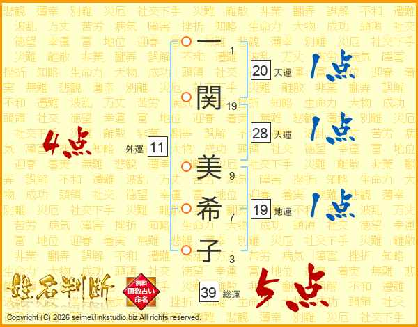 一(1画)関(19画) 美(9画)希(7画)子(3画)