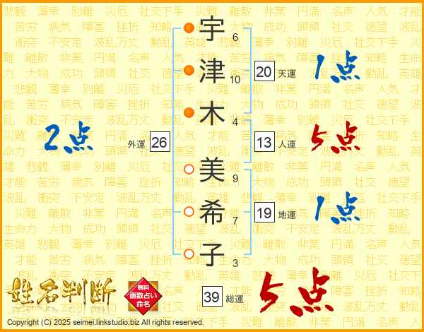 宇(6画)津(10画)木(4画) 美(9画)希(7画)子(3画)