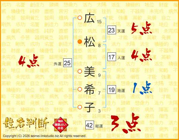 広(15画)松(8画) 美(9画)希(7画)子(3画)