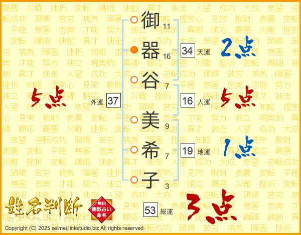 御(11画)器(16画)谷(7画) 美(9画)希(7画)子(3画)