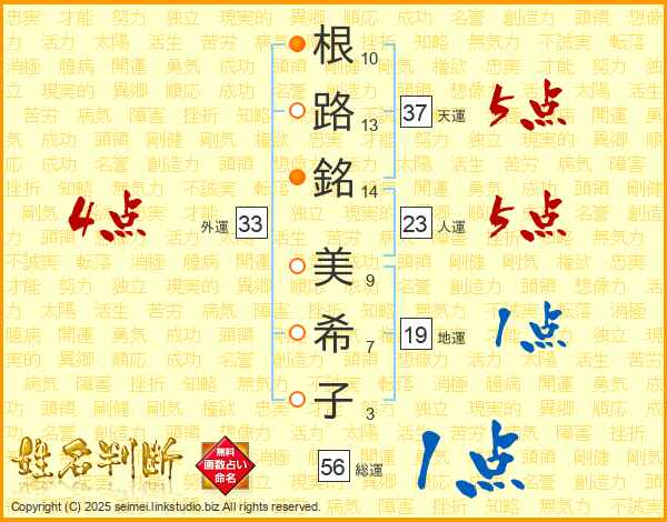 根(10画)路(13画)銘(14画) 美(9画)希(7画)子(3画)