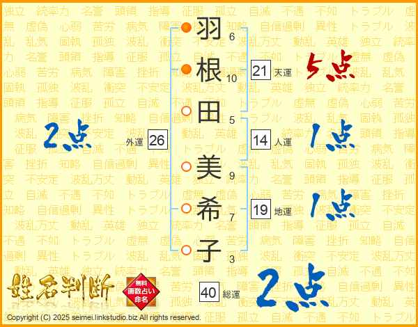羽(6画)根(10画)田(5画) 美(9画)希(7画)子(3画)
